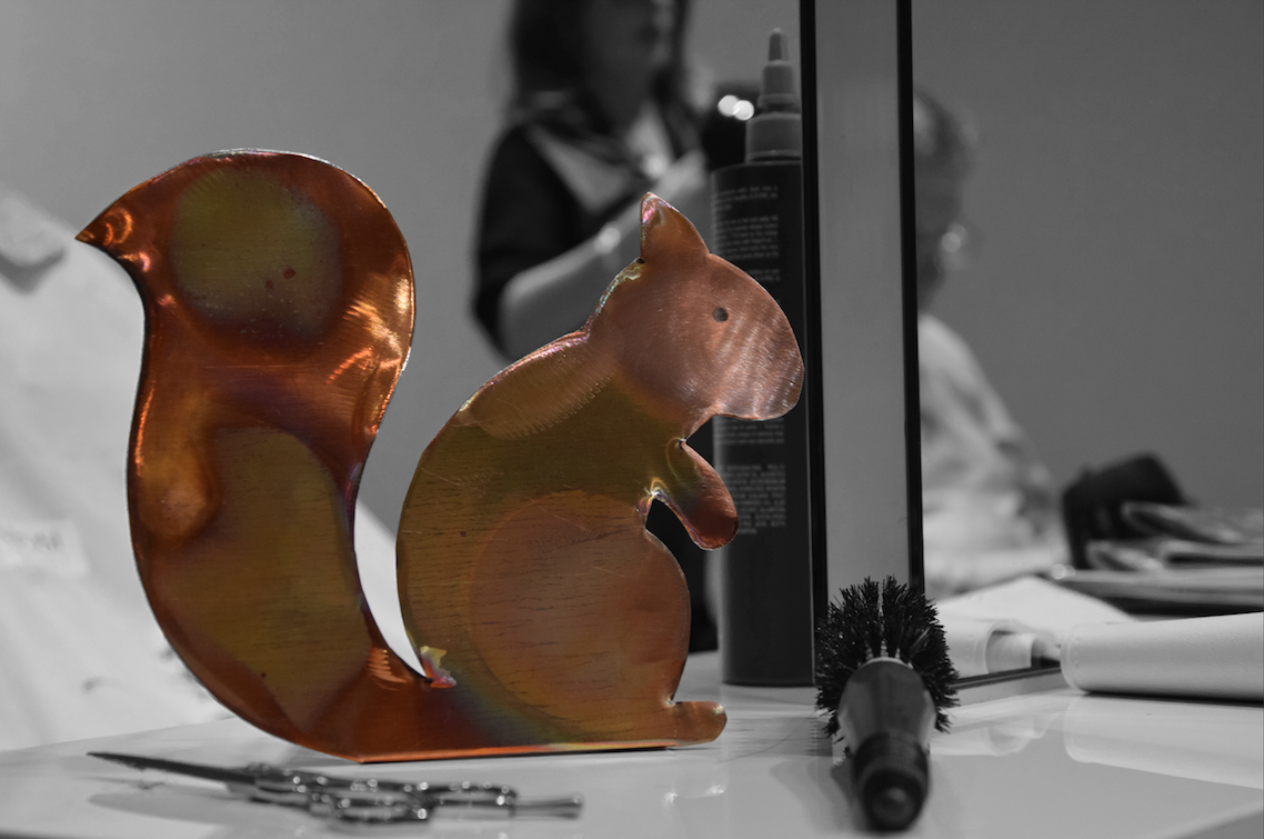 Scoiattolo Rodrigo in rame bruciato – Farfalle Aurora – Picchio Felice
